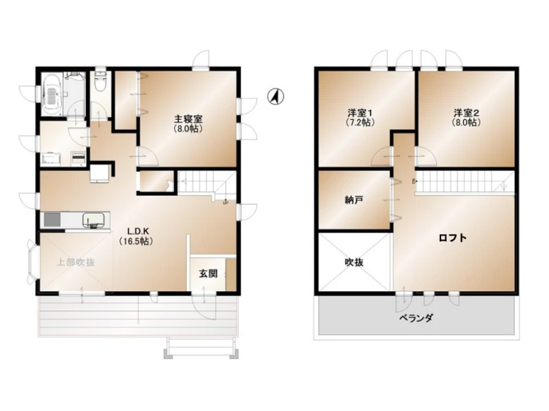 | 設備 | 浄化槽、IHクッキングヒーター、ルーフバルコニー、南面バルコニー、ワイドバルコニー、ウッドデッキ、出窓、ロフト、照明器具付き、エアコン、庭10坪以上、カウンターキッチン、浴室1坪以上、浴室に窓、洗面台、トイレ、洗面所、収納スペース | ||